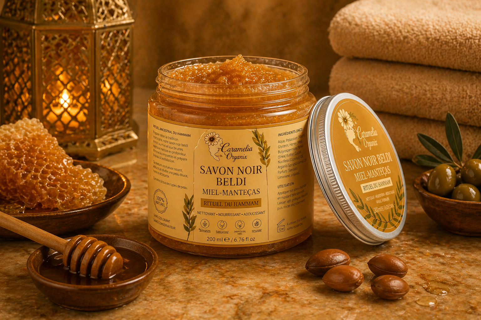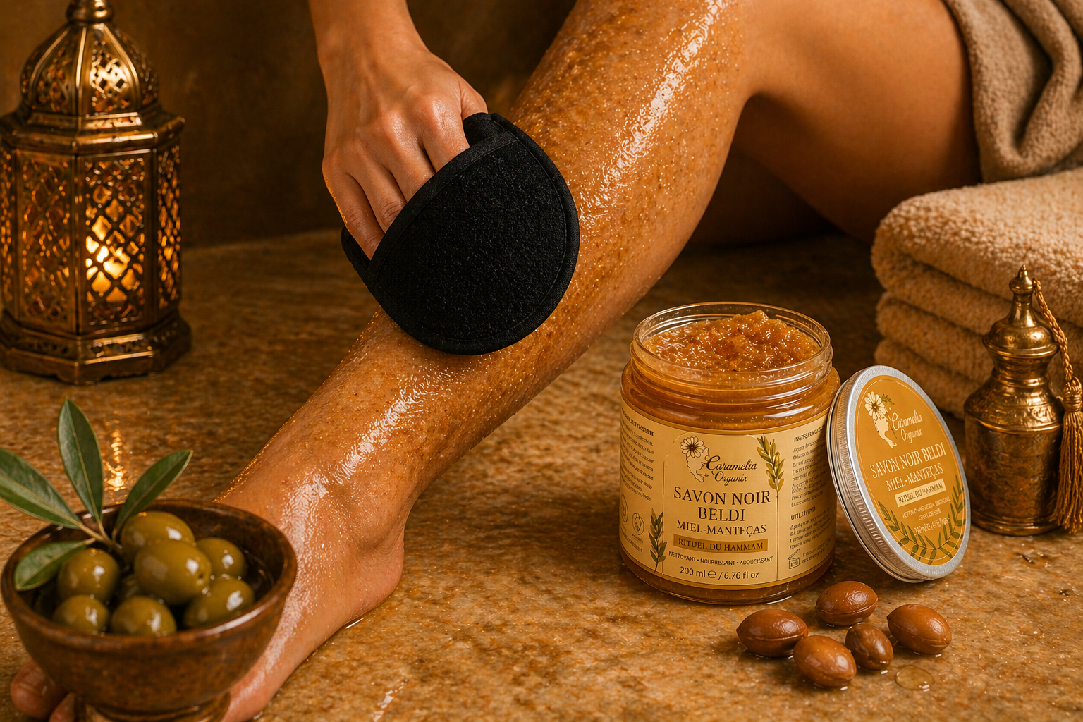 Découvrez un rituel ancestral de beauté avec notre savon noir beldi au miel et beurres végétaux.